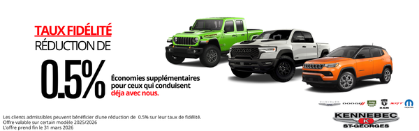 Avec Kennebec Dodge Chrysler, vous pourrez économiser à l’achat d’un véhicule neuf ou d’occasion Chrysler, Jeep, Dodge, Ram ou Fiat, mais les rabais ne s’arrêtent pas là. En effet, vous aurez également droit à des rabais et offres spéciales lorsque vous venez nous voir pour l’entretien de votre véhicule ainsi que pour une pièce ou un accessoire d’origine Chrysler, Jeep, Dodge, Ram ou Fiat spécifique. Nous cherchons à nous démarquer notamment en vous permettant d’économiser lors de chaque visite. Nos départements du service et de l’entretien esthétique regorgent aussi de rabais et d’offres saisonnières. Nos promotions sont régulièrement mises à jour alors revenez souvent voir cette page!